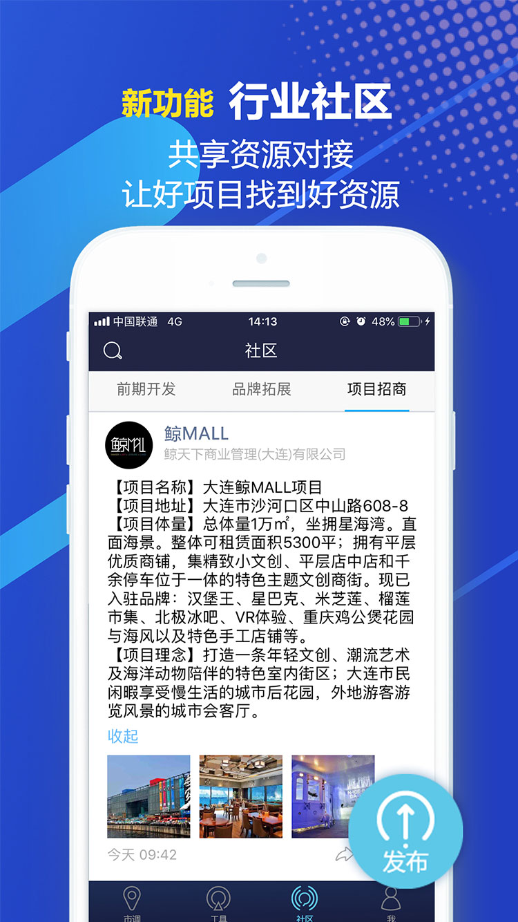 目前【社区】中设置了针对性的三大模块 分别为【前期开发】、【品牌拓展】、【项目招商】。用户可根据 自身发布类型匹配选择。这样可以更便于大家浏览各自主要关注的服务方向,内容类型。