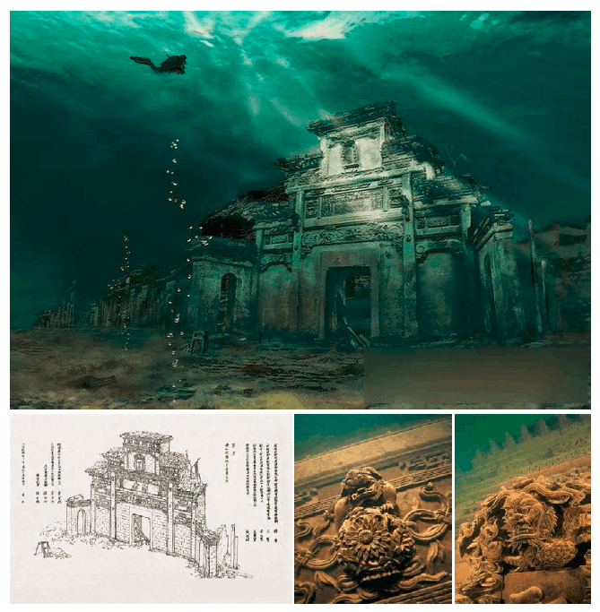 1959年,为建造新安江水电站,狮城、贺城两座古城,和27个乡镇、1000多座村庄、30万亩良田,都沉入了千岛湖底。2005年,本地旅游局再次发现,千岛湖水底除了狮城和贺城两座古城,还有威平、港口、茶园这3个大型古集镇,保存的数座水下古城共同构建了一个完整的水下古建筑群。