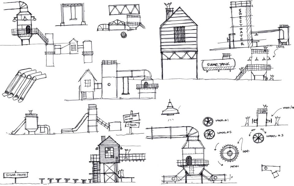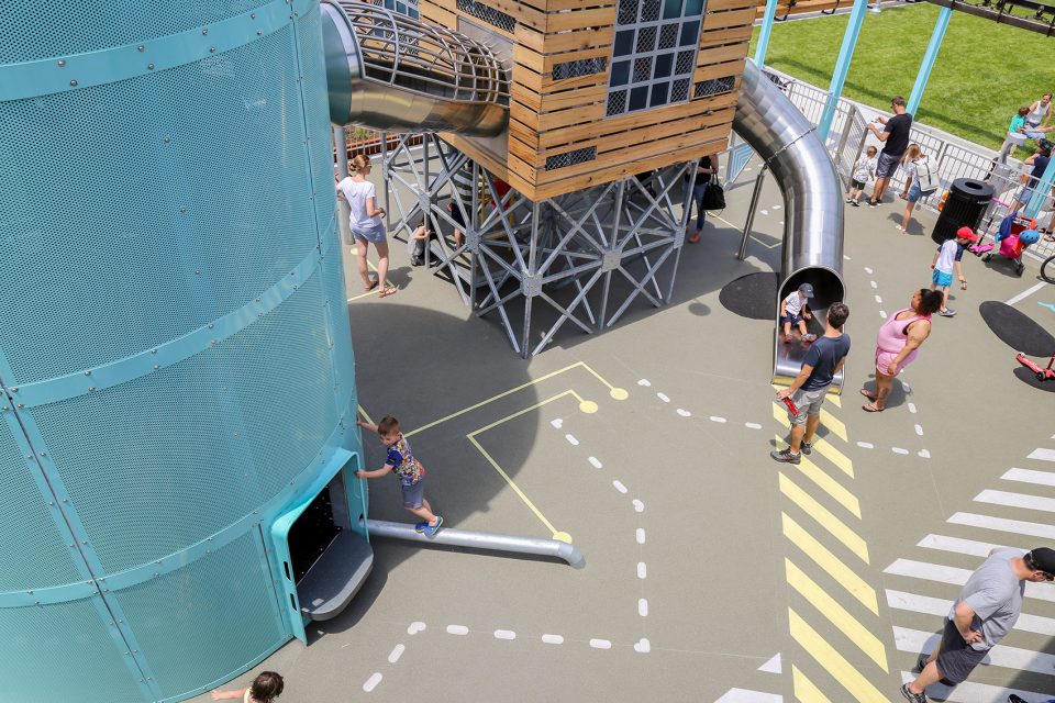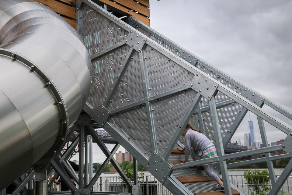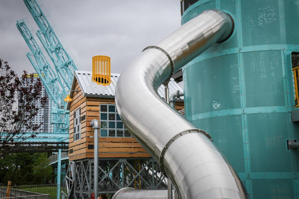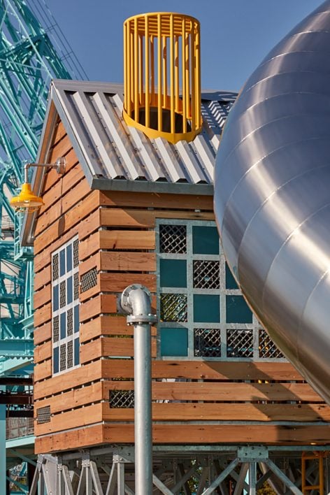 为了与老工厂的色调相配,Reigelman将亮黄色,青绿色,绿色和拉丝金属色与现存的工业文物和工业元素相结合。工厂车间重复使用的木材被用于高架舱的外立面上,旁边是色彩艳丽的工厂随处可见的阀门轮。游乐园的三个主要部分—一个抬高的小屋,一个高高的筒仓,和一个工业集装箱,其他诸如不锈钢滑梯,攀爬处,以及走道,都能令人想起老工厂的复杂建筑和基础设施。