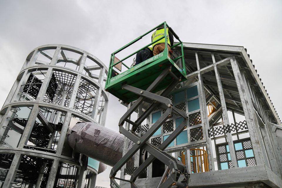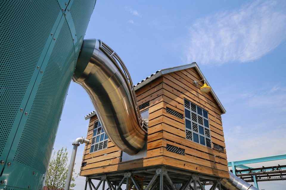 游乐场由一个抬高的小屋,一个高高的筒仓,和一个工业集装箱组成。