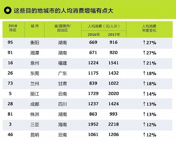 而从数据上,表现“膨胀”的目的地城市有湖南的衡阳和湘潭,与去年相比,人均旅游消费均猛涨了27%。福建泉州也有明显的涨幅,人均旅游消费上升了21%达到了1541元。