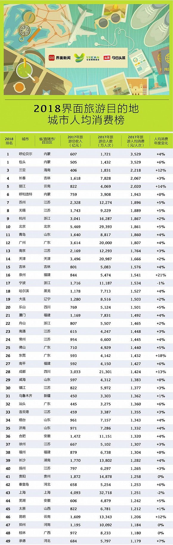 榜单中旅游人数最多的目的地城市依然是上海,人均消费是1251元,与去年相比,还下降2%,排在第43名,较去年下降了10位。旅游收入最多的目的地城市为北京,2017年旅游总收入为5469亿元,位列第十,人均旅游消费是1861元,较去年增长5%。