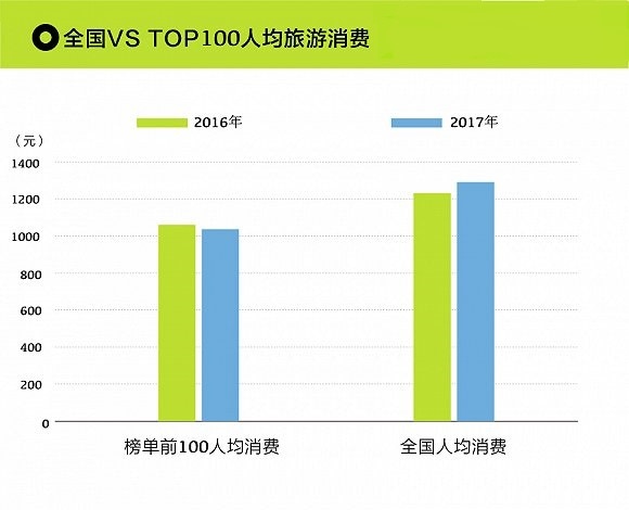 根据国家旅游局2018年2月发布的《2017年全年旅游市场及综合贡献数据报告》,2017年全国旅游总收入达到5.4万亿元,旅游总人数为52.71亿人次。全国人均旅游消费为1024元,与去年相比,相差不大。今年榜单中的一百城市的人均旅游消费达到1292元,而去年只有1251元,相比之下稍有上涨趋势。