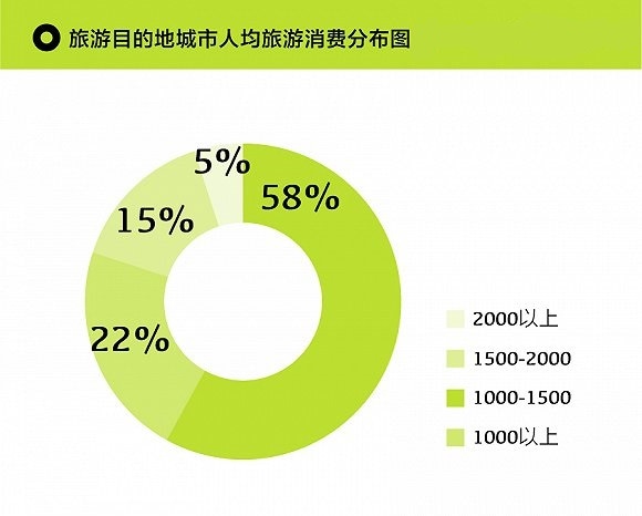 从人均旅游消费分布来讲,2000元以上的目的地城市只有5个,分别为呼伦贝尔,包头,三亚,长春和丽江。人均旅游消费在1500元到2000元之间的目的地城市有15个,而人均消费在1000元到1500元的目的地城市有58个,超过一半,而1000元以下的城市有22个。
