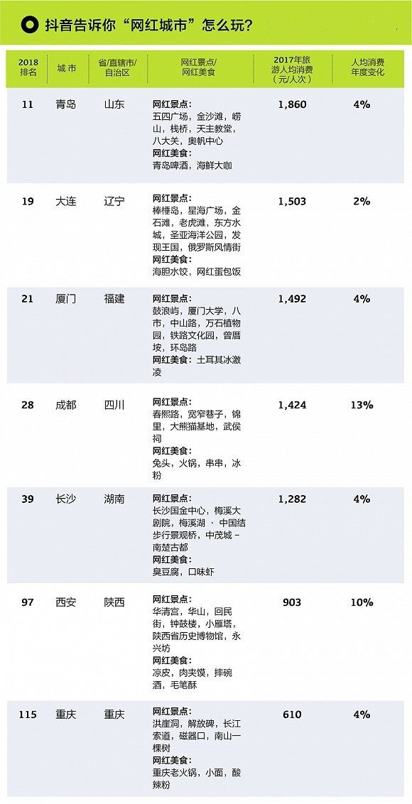 抖音的出现,捧红了祖国大地的众多旅游目的地城市,例如青岛,大连,厦门,成都,长沙,西安,重庆等。没有抖音,都发现不了国内原来有这么多好玩的地方:虽然没时间去浪漫的土耳其,可是我们能找个周末去厦门吃土耳其冰激凌,和土耳其大叔斗智斗勇,乐趣无穷;“摔碗酒”摔到西安爆红,各种精致小吃让我们认识了不一样的西安。重庆接待游客很多,可是由于其旅游转化率不足,没有将充足的游客资源转化为旅游收入,游客的人均消费只有610元,没达到我们榜单的门槛,性价比极高。