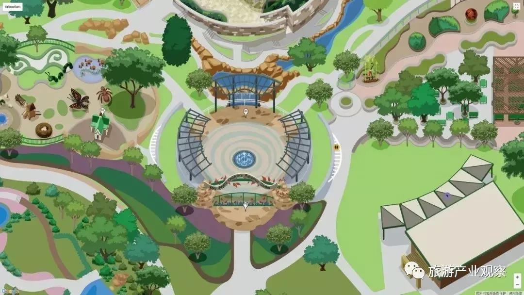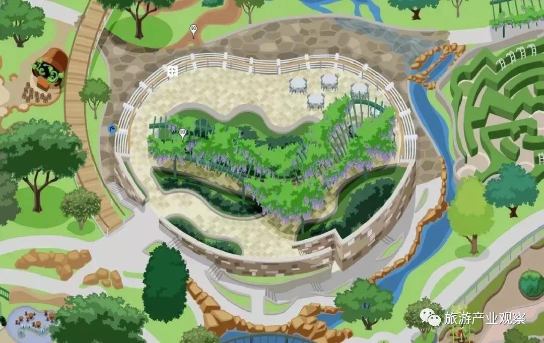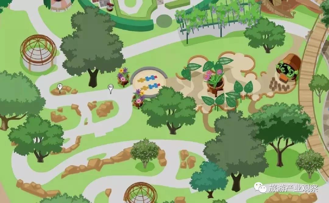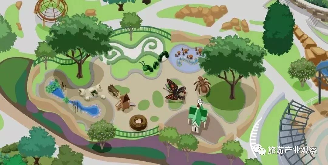 这个区域是一个儿童嬉戏天地,一个带围墙的花园,里面设置了许多昆虫和小动物的模型,让孩子们在大自然中玩耍。 此外该区域还设置了一个迷宫,一个盆栽棚,一个树洞,一条小溪。