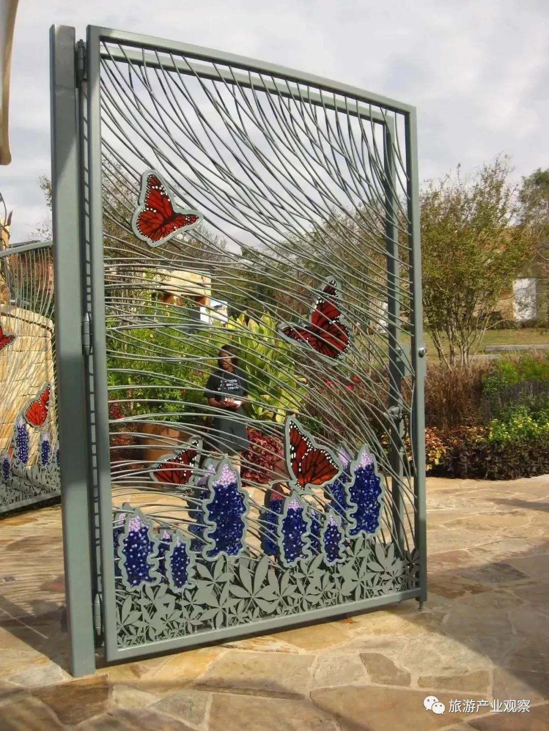 入口广场设计为足够容纳200人的互动喷泉广场,人对水有天生的亲近感,小朋友们玩得更是不亦乐乎!此外还有带遮阳的圆形剧场,而入口大门整体设计朴素简单,以铁艺为主,提取树叶和蝴蝶等元素来装饰,顶部以一个飘带形式铁艺贯穿,与公园logo巧妙结合,采用对称的形式。
