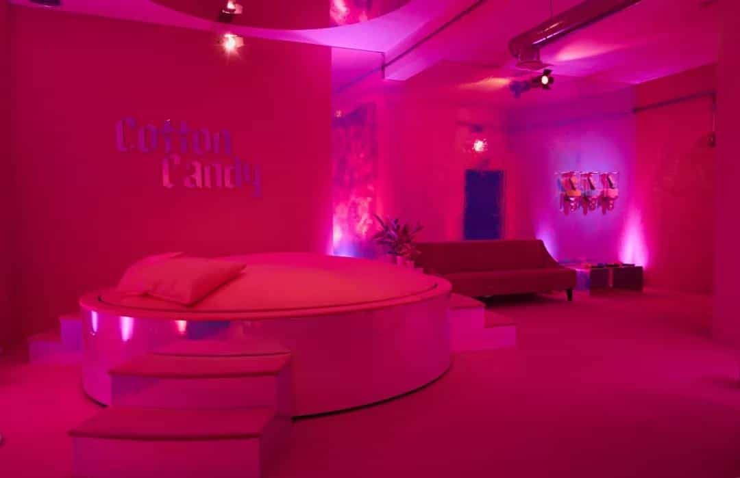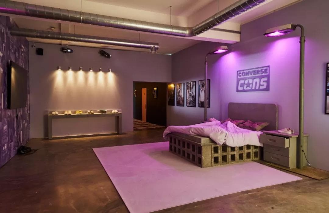 每个房间都设置了不同的主题,房间运用最新 One Star Premium Suede系列的柔和色彩,在灯光的照耀下,有些迷幻色彩。房内展示了CONVERSE经典的鞋子,每双都想打包带走!