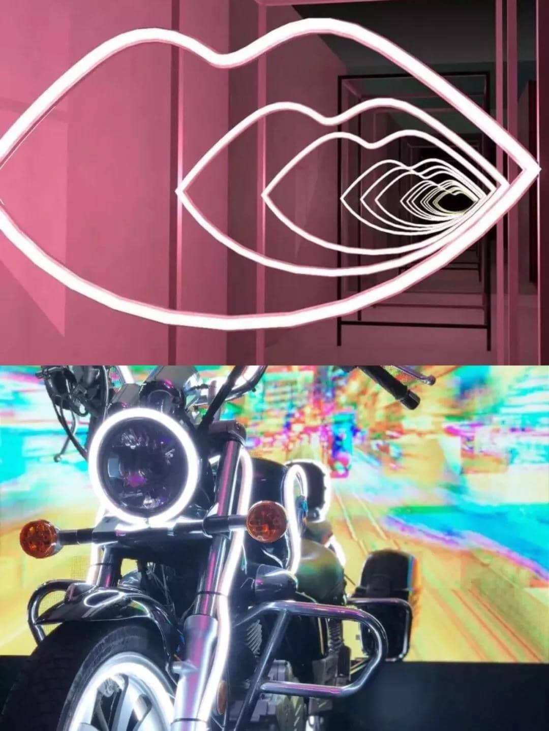 Pink Room的入口处一条粉红色唇形霓虹灯隧道,是不是超迷人?利用前后的镜子效果,打造出既有少女感又梦幻的走廊。Black Room的主题则是酷酷的摇滚风,标志是一辆 Black Opium 摩托车,超多网红在这里凹造型!