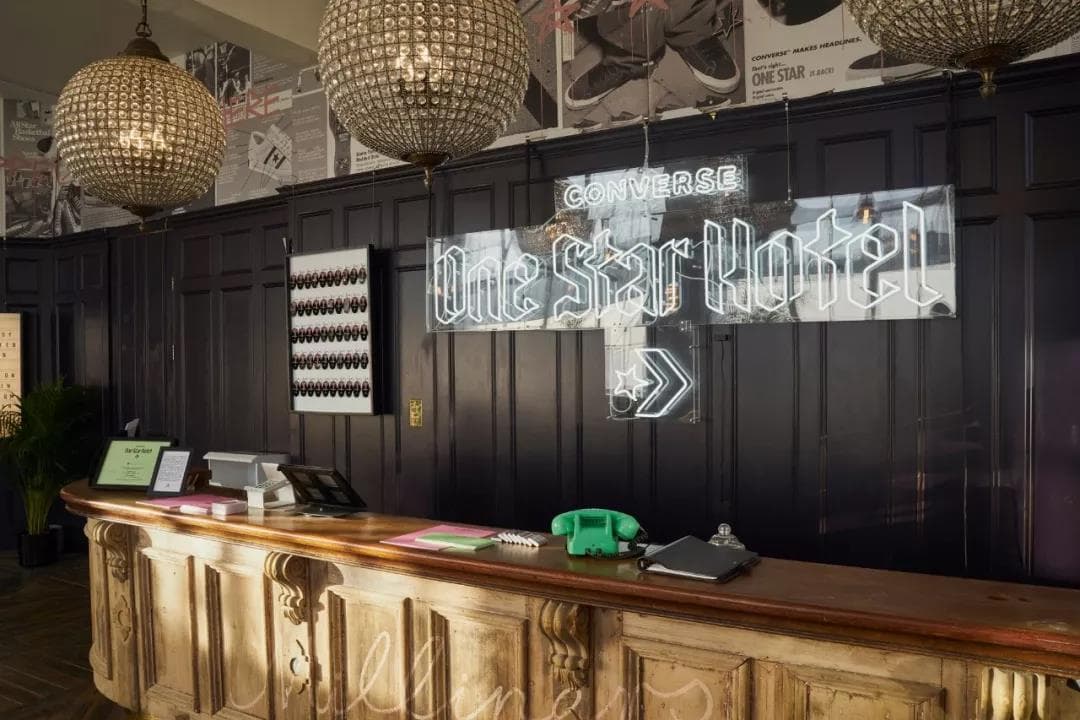 今年2月,匡威在伦敦开了一家快闪潮流酒店CONVERSE THE ONE STAR HOTEL,虽然只开放三天,但立马就刮起了一阵潮流旋风。