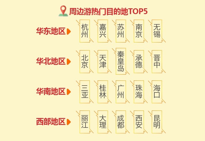黄金周期间选择短途周边游放松身心的游客也不在少数。一方面,短途周边出游时间较为自由,可更为自由地避开出行高峰;另一方面,出行成本受旅游产品价格波动的影响较小,小客车还可在节日期间享受高速免费通行政策,有利于降低出行成本。从各区域国庆期间旅游情况看,华东地区的热门目的地分别为杭州、嘉兴、苏州、南京、无锡,华北地区的客流主要前往北京、天津、秦皇岛、承德、晋中,华南的游客较为青睐三亚、桂林、广州、珠海、海口,西部的丽江、大理、成都、西安、昆明等目的地人气较为靠前。