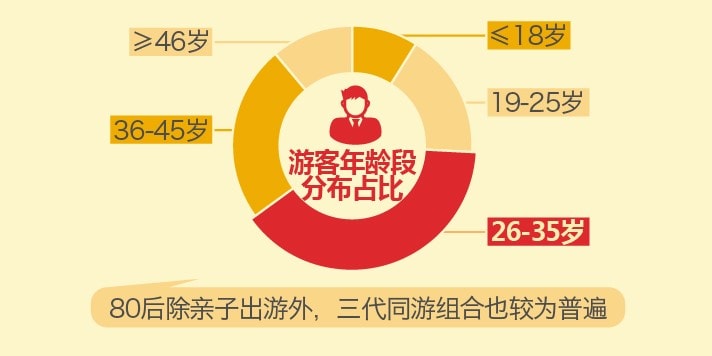 在游客年龄段分布方面,26-35岁年龄段客人是今年国庆假期出游主力军,占比高达39%,其次为36-45岁的游客,占比为24%。其中,80后除了亲子出游,三代同游组合也较为普遍。与此同时,26岁以下的年轻游客出游比例较其他时间段有所下降,这与国庆旅游产品价格高涨以及该年龄段用户错峰游意识较强等诸多因素有关。