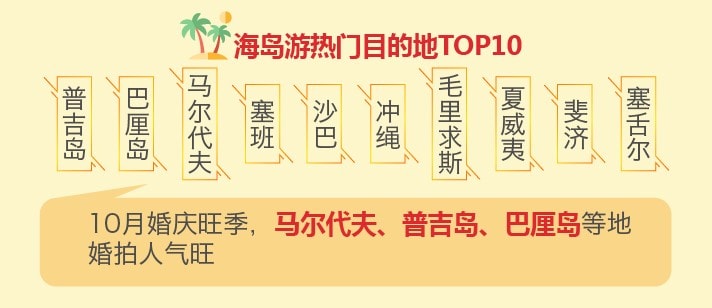海岛也是今年较多游客国庆出游的首选,游客普遍青睐普吉岛、巴厘岛、马尔代夫、塞班、沙巴、冲绳、毛里求斯、夏威夷、斐济、塞舌尔。由于10月是婚庆旺季,除了度蜜月的夫妻游客外,不少游客选择海岛旅拍,“马尔代夫阿雅达岛Ayada婚纱旅拍5晚7日游”、“巴厘岛婚纱旅拍5晚7日游”、“泰国普吉岛婚纱旅拍4晚6日游”等婚纱旅拍产品在国庆期间受到较多新婚用户追捧。