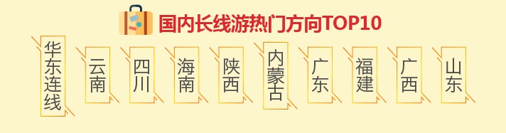 国庆期间,国内游人次占出游总人次的54%。在国内长线游方向,人气最旺的为华东连线、云南、四川、海南、陕西、内蒙古、广东、福建、广西、山东。其中,云南、海南、四川等地旅游热度常年不减,内蒙古等地的火爆与胡杨林进入赏秋旺季有着密切关系。除以上热门目的地之外,10月份正值最佳旅游季的西藏在国庆期间也同样热闹,不少游客为了一睹南迦巴瓦峰真容,选择在国庆期间前往墨脱徒步或是穿越阿里、川藏、滇藏等。