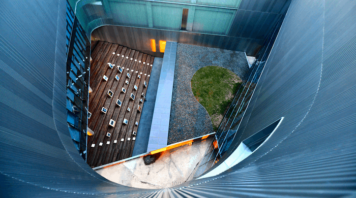 中心内部由盘旋环绕的建筑形体围合出一个由美术馆、印刷工厂、办公空间、底层公共空间等多个部门共享的空中花园。作为独立于外部不利因素的企业内部环境,在空间组织方面,将美术馆从公共属性的功能部分分离,与企业总部并列,独立地悬浮在景观资源最好的顶部,形成独立的艺术空间。