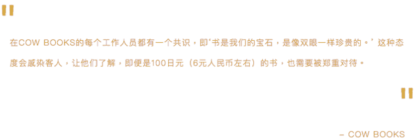 关于日本书店的采访文集《东京本屋》中,作者形容 COW BOOKS 在日本独立书店的小圈子当中是服务细腻的典范,“去过 COW BOOKS 的人会发现,店里并没有二手书店独特的那种味道。购入的二手书,首先要仔细确认有没有瑕疵、笔迹,并进行清洁处理。若封面有损坏,用透明塑料膜来进行保护。除了书之外,书架也经常擦净—彻底地擦净,先把所有的书都拿出来,用干净的布块把每个角落用心擦。”事实上,这些细节上的用心并非都是严格培训的结果,更多源于松浦弥太郎成立书店之初树立的理念: