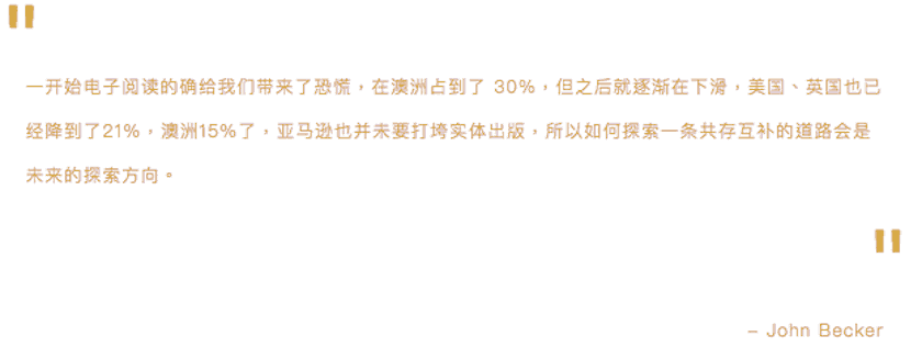 在与澳大利亚书商协会(Australian Booksellers Association,ABA)首席执行官 John Becker 闲聊的过程中我们得知,拥有2400万人口的澳大利亚,有900-1000家实体书店,其中约有600家书店和小型出版商是澳大利亚书商协会的成员。
